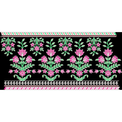 This illustration presents a beautifully arranged embroidered floral border design set against a deep black background. The composition features repeating vertical floral bouquets with blooming pink flowers and soft green leaves, creating a fresh and balanced visual rhythm. Smaller floral motifs are placed above the main bouquets, adding lightness and decorative detail to the overall design.