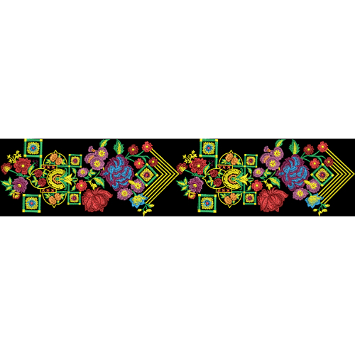 A vibrant embroidered border design combining colorful floral elements with geometric and ornamental motifs, ideal for decorative textile borders and luxury fabric applications.
