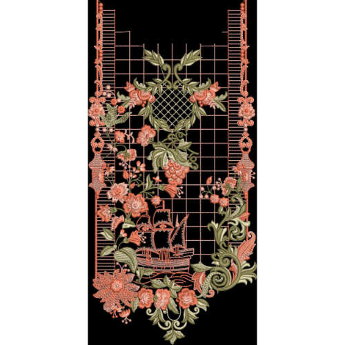 The upper section features a geometric lattice pattern that adds architectural balance, while the floral vines cascade naturally across the grid, creating a harmonious blend of structure and organic movement. Decorative side borders with fine embroidery-style detailing enhance the panel’s vertical elegance, making it visually rich and well-balanced.