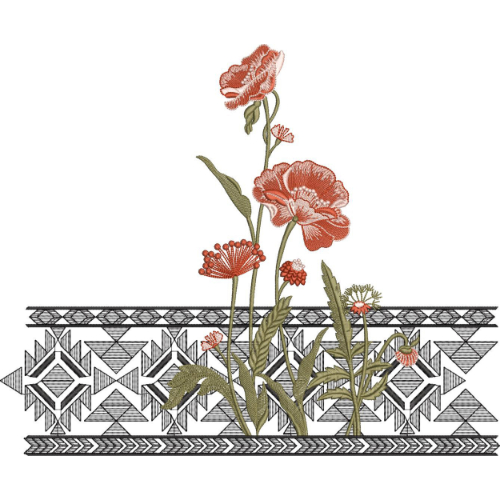 Embroidered Floral Motif with Geometric Border and Poppy Blossoms