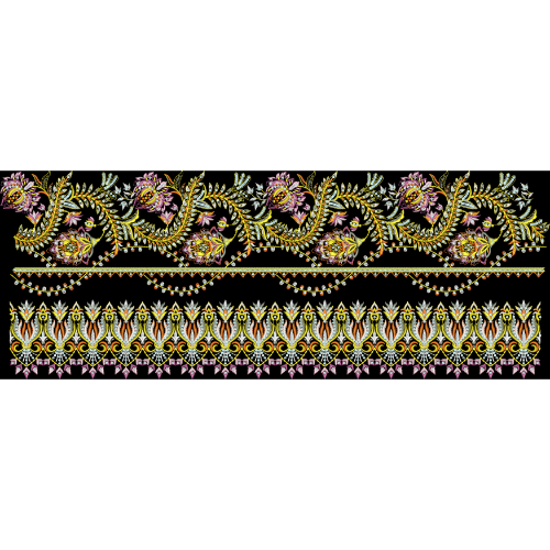 The lower section displays a structured repeating border pattern composed of elongated floral and geometric elements, creating balance and visual continuity. Fine embroidery-style stitching gives the artwork a handcrafted, luxurious appearance, while the symmetrical repetition makes it ideal for continuous textile border use.