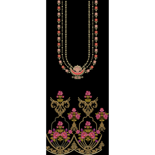A luxurious embroidered design inspired by traditional jewelry patterns, featuring floral elements and ornate borders, perfect for ethnic textile and garment embellishments.