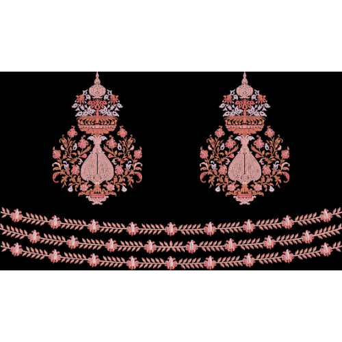 An elegant embroidered design featuring symmetrical ornamental motifs paired with layered floral borders, ideal for refined textile borders and traditional fabric embellishments.