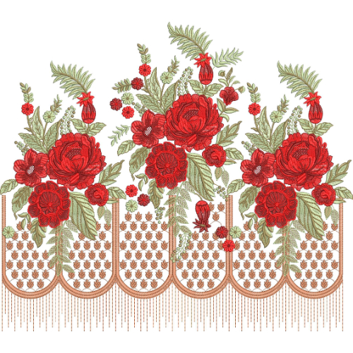 A graceful embroidered floral border featuring rich red rose bouquets with leafy accents and a decorative arch base, ideal for elegant textile and garment border designs.