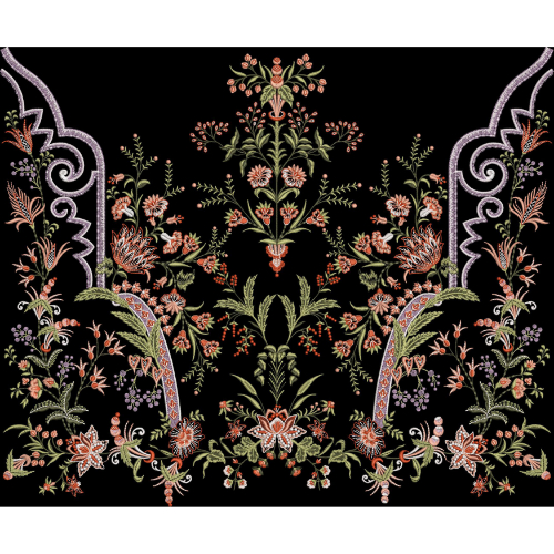 Embroidered Symmetrical Floral Panel with Ornamental Curved Borders