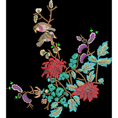 Floral and Bird Embroidery Motif Textile Design on Black