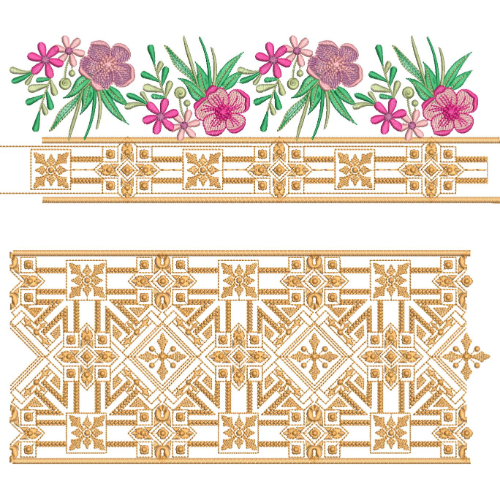 Floral and Geometric Lace Embroidery with Ornamental Panel and Border Detailing