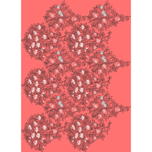 The artwork is rendered in fine black line art, allowing the detailed floral outlines to stand out clearly against the warm coral background. This contrast gives the design a bold yet elegant appearance, blending artistic illustration with modern textile aesthetics. Subtle variations within each floral cluster add depth and prevent visual monotony.