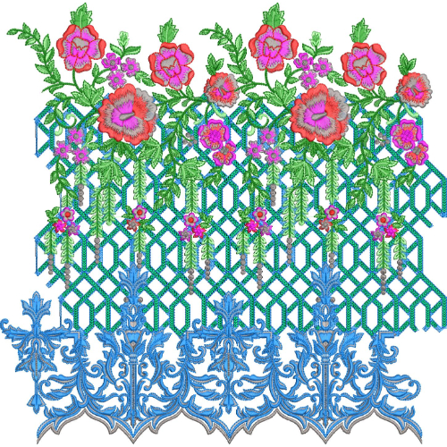 This lace embroidery design features a richly layered border that combines vibrant floral motifs, a structured geometric net background, and an ornate ornamental base. The composition is arranged in horizontal sections, creating a visually striking balance between natural and decorative elements.