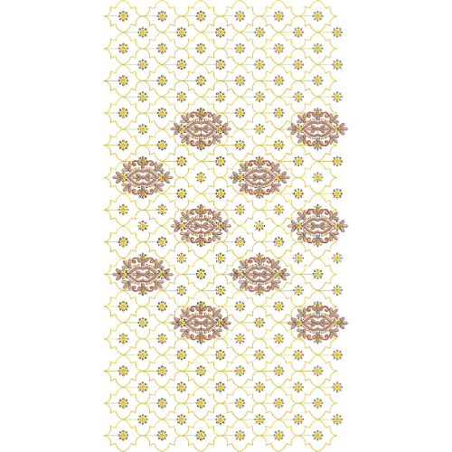The combination of a dense floral lattice with highlighted ornamental butas results in a harmonious and visually rich embroidery pattern. The consistent repetition of the net structure and the balanced positioning of the main motifs allow the design to extend seamlessly across the layout. This all-over jaal embroidery style reflects a classic ornamental aesthetic, blending fine detailing with structured elegance to create a sophisticated and decorative composition.