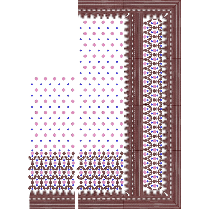 This saree embroidery design features a unique blend of geometric precision and delicate buti motifs, combined with a bold and structured ornamental border. The central area is decorated with evenly spaced small butis, enhanced with subtle multicolor accents that add vibrancy while maintaining a clean and organized layout.