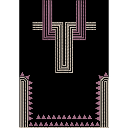 Two vertical side panels with repeating triangular accents frame the composition, giving the layout a border-style appearance suitable for garment panels or statement textile designs. The black background enhances the contrast and clarity of the geometric elements, creating a refined and modern aesthetic. This design is ideal for fashion garments, embroidered-style outfits, tunics, kurtis, abayas, dupattas, and decorative textile panels. The clean structure and embroidery-inspired detailing make it suitable for premium digital textile printing and high-quality fabric production.