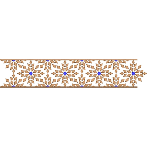 The motifs are interconnected through a network of angular and linear embroidery elements, creating a cohesive and continuous pattern across the border. This arrangement produces a lattice-like effect while maintaining clarity and structure.