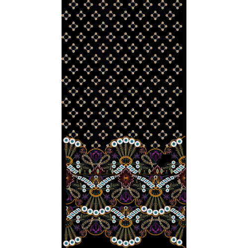 A decorative textile print featuring a repeating small geometric motif pattern on the upper area and an elaborate multicolor ornamental floral border at the bottom on a black background.