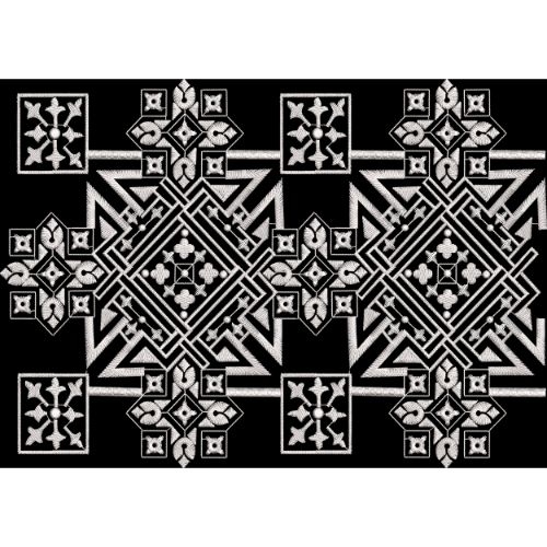 This textile print presents a striking geometric pattern inspired by traditional tribal embroidery and architectural motifs. The design is composed of repeating symmetrical shapes arranged in a horizontal layout, making it especially suitable for borders, all-over fabric prints, rugs, shawls, and statement textile applications. The precise alignment of squares, diamonds, and angular forms creates a strong sense of structure and rhythm.