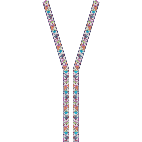 A modern Y-shaped neckline trim featuring a continuous geometric pattern in soft multicolor tones, designed for clean and contemporary garment detailing.