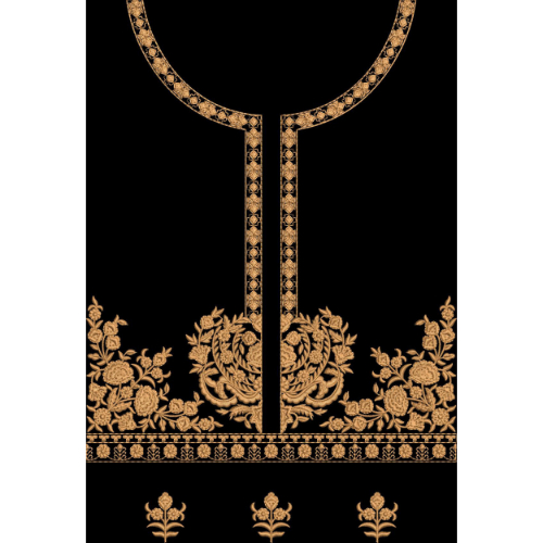 Created as a high-resolution 300 DPI illustration, this embroidery design is ideal for kurti fronts, shirt yokes, kameez panels, bridal wear, festive outfits, and traditional ethnic garments. Its timeless golden-on-black contrast makes it suitable for both embroidery digitization and premium textile printing applications.