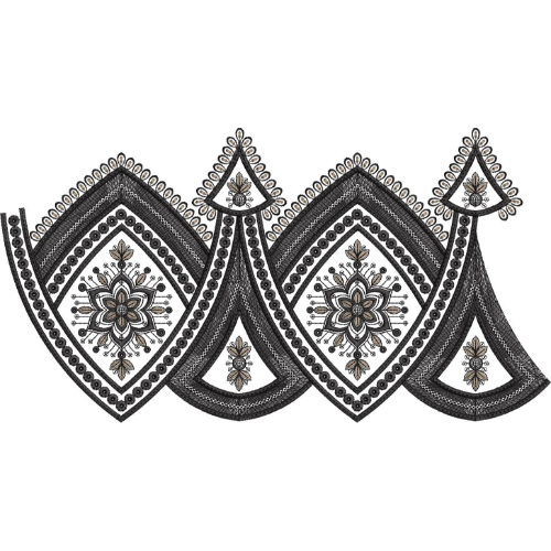 This lace embroidery border design is ideal for formal dresses, bridal wear, dupatta trims, abaya edges, and couture garments where bold geometric styling and intricate floral detailing are desired for a statement finish.