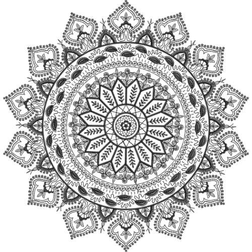 This textile design features an elaborate circular mandala composition inspired by traditional embroidery techniques and ornamental folk patterns. The motif is perfectly symmetrical, radiating outward from a detailed central core, making it ideal for placement on garment panels, shawls, dupattas, scarves, cushion covers, wall textiles, and statement fabric designs.