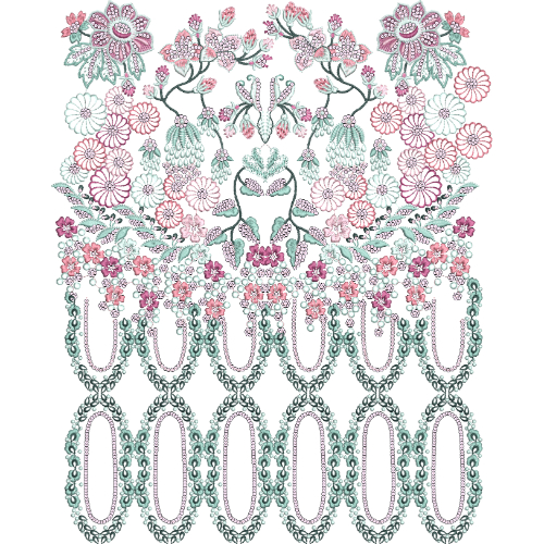 Below the floral arrangement, the design transitions into a series of elongated oval-shaped motifs arranged in a repeating pattern. These elements are framed with intricate lace-like detailing and connected through ornamental stitching, forming a decorative lower section that adds depth and visual interest.