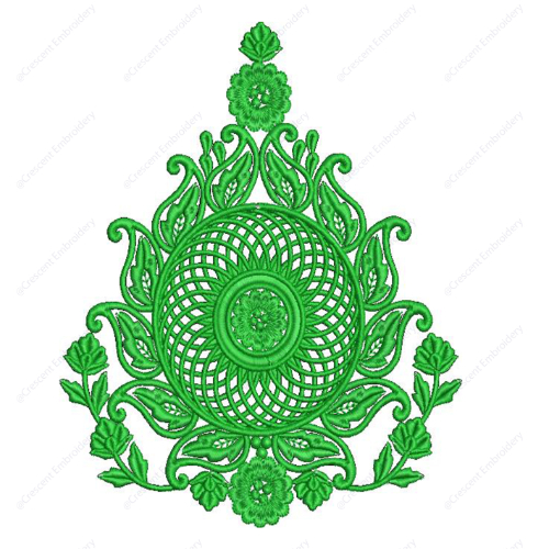 Intricate Green Circular Cushion Embroidery Design with Lattice Center and Ornamental Leaves