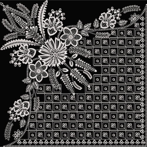 Intricate White Floral Embroidery Style Corner Textile Design on Black Base