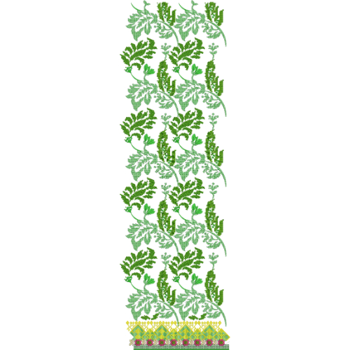 The repetition of the vine pattern creates a seamless upward movement, maintaining consistent spacing and smooth continuity throughout the layout. The tonal variation within the green thread palette enhances visual richness and emphasizes the layered structure of the foliage.