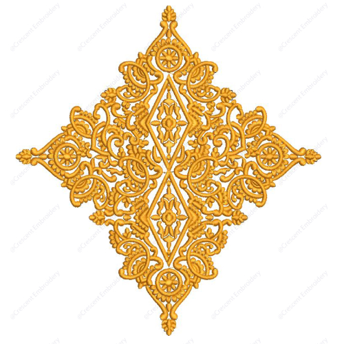 This exquisite embroidery design features a highly detailed ornamental composition arranged in a striking diamond-shaped layout. At the center, elongated diamond motifs are layered vertically, each filled with intricate floral and geometric detailing that creates a strong and elegant focal structure.