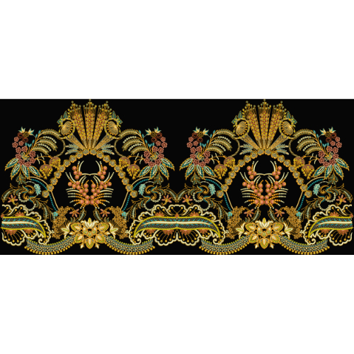 This textile design showcases an opulent border composition inspired by traditional royal embroidery and ornamental craftsmanship. The background is a solid deep black, which enhances the brilliance and depth of the golden-toned artwork. The design is arranged horizontally, making it ideal for use as a garment border, hemline, or decorative textile edge.