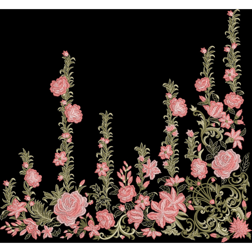 This illustration presents an exquisite embroidered floral border design set against a deep black background, enhancing the richness and clarity of the detailing. The composition features lush rose blossoms in soft pink tones, arranged in varying heights to create a graceful, garden-like flow. Slender floral stems rise vertically, adding elegance and depth, while smaller blossoms, buds, and leaves fill the lower section.