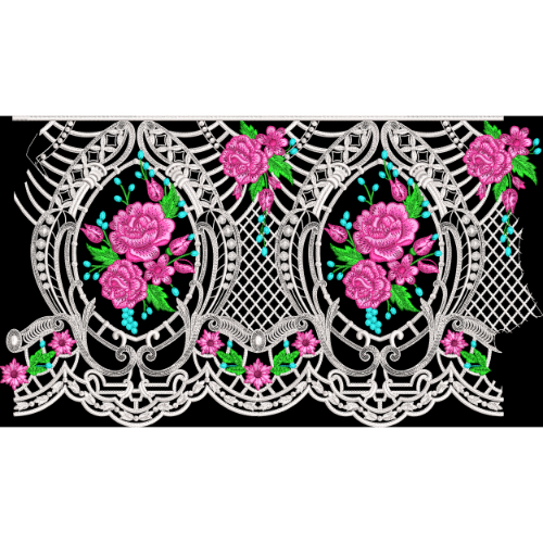 The background is a deep black, which enhances the brilliance of the silver lace patterns and intensifies the richness of the pink florals. The lower edge is finished with a scalloped lace border, giving the design a graceful and luxurious finish.