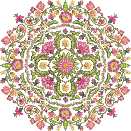 An exquisite circular floral mandala textile design featuring intricate botanical detailing and symmetrical ornamentation. The soft pink, green, and golden accents create a refined and elegant look ideal for premium fabrics.