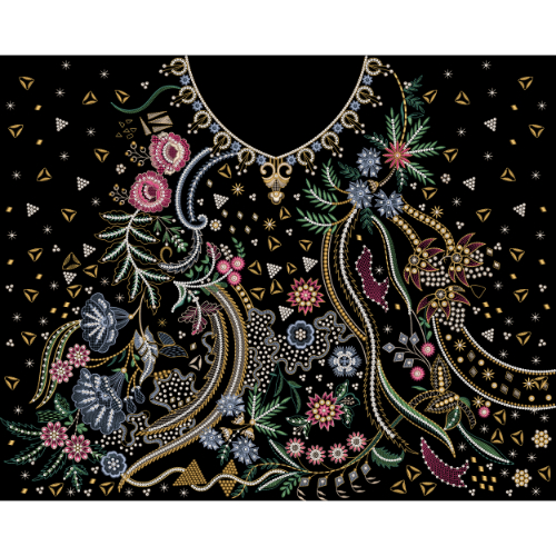 Scattered across the background are small geometric and floral dot motifs, enhancing texture and visual richness without overpowering the main composition. The intricate stitch-style detailing closely resembles hand embroidery, giving the design a refined artisanal character.