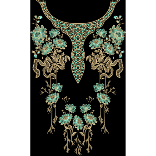 Luxury Floral Neckline Front Panel Design with Turquoise Stone Detailing on Black Background for Textile Prints