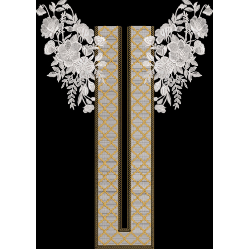 This textile design presents a sophisticated neckline panel composition created specifically for high-end garment placement. The design features a central elongated neckline panel framed with a refined geometric pattern in soft gold and white tones, forming a structured and symmetrical layout. The clean vertical alignment enhances the elegance of the overall design, making it perfect for front panels of formal and ethnic garments.