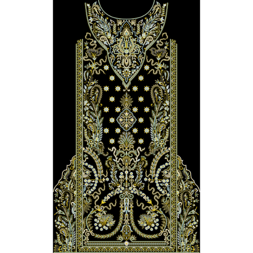 Luxury Gold Ornamental Embroidered Front Panel Design on Black Background for Textile Prints