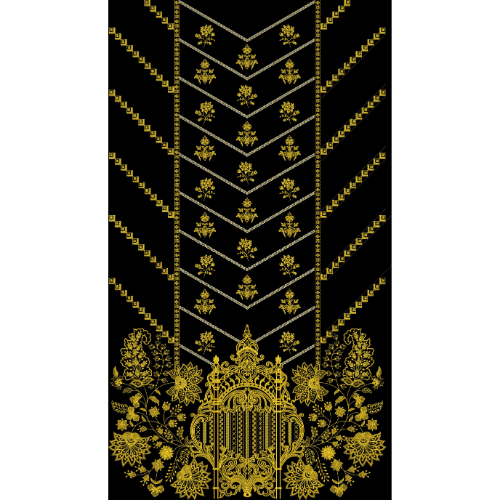 The black background enhances the brilliance of the gold detailing, creating a striking contrast and emphasizing the richness of the design. This front panel design is ideal for use on kurtis, long shirts, anarkali dresses, festive wear, bridal outfits, and formal ethnic garments. It is also suitable for digital textile printing, embroidery reference designs, zari-inspired artwork, and premium surface pattern projects. The overall aesthetic reflects elegance, tradition, and timeless luxury, making it a perfect choice for high-end textile collections.