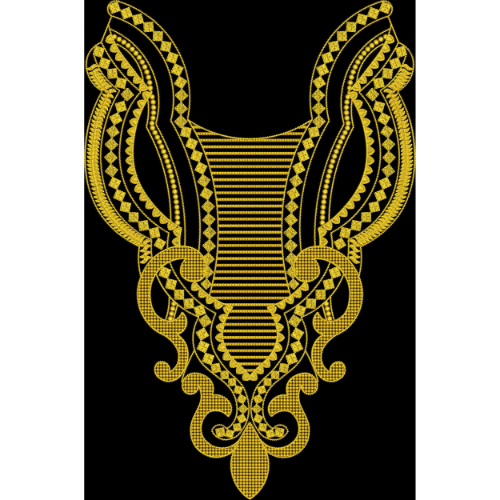 This striking textile print showcases a richly detailed neckline and front panel design inspired by traditional ornamental and geometric embroidery. The composition features a structured neckline at the top, flowing downward into an elaborate arrangement of curved and symmetrical decorative elements.