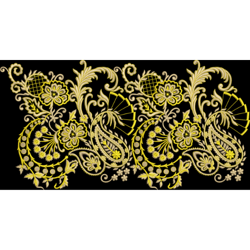A luxurious golden paisley floral border featuring intricate ornamental embroidery on a black background. Perfect for sarees, lehengas, dupattas, and premium textile prints, adding a rich and royal touch to fabrics.