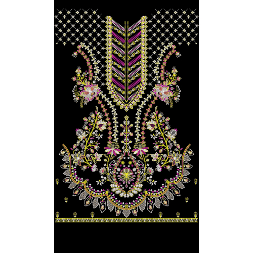 A rich multicolor neckline embroidery design featuring floral vines, lattice detailing, and an ornate central motif on a black background.