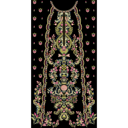 The deep black background amplifies the richness of the colors and highlights every intricate detail with clarity and depth. This textile print is ideal for luxury kurtis, gowns, dresses, festive wear, bridal and formal garments, and premium embroidered-style fashion panels. The high-resolution quality ensures excellent results for digital textile printing and high-end fabric applications.