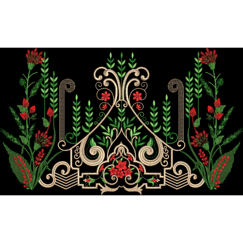 The deep black background intensifies the richness of the colors, allowing the gold, green, and red embroidery-style details to stand out prominently. The overall composition reflects a fusion of floral elegance and ornamental craftsmanship.