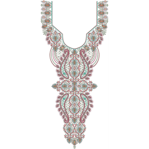 This luxury neckline embroidery design showcases an exquisite combination of intricate paisley motifs and detailed ornamental patterns, creating a rich and elegant neckline composition. The design is structured in a deep rounded neckline layout that flows into a long decorative panel, giving it a grand and couture-inspired appearance suitable for statement garments.
