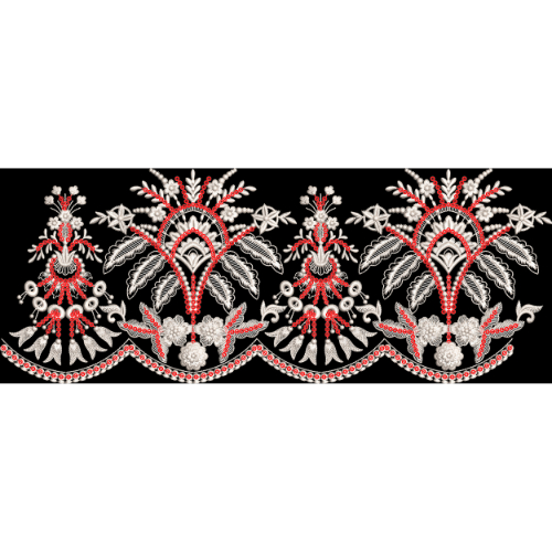 An elegant ornamental embroidery border featuring intricate red, silver, and white thread-style motifs on a black background. Ideal for sarees, lehengas, gowns, and premium textile decorations, offering a royal and festive look.