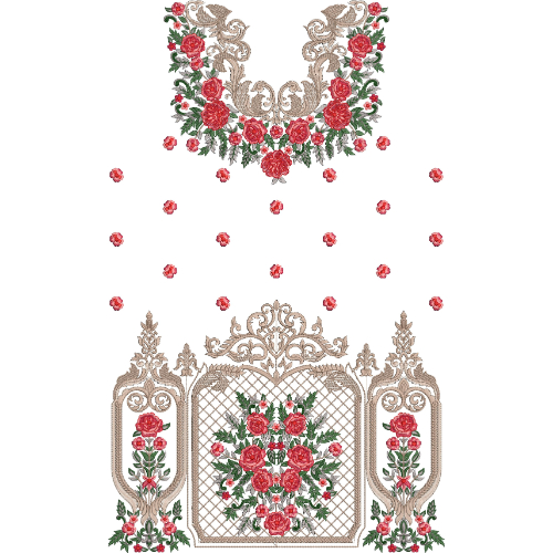 The harmonious combination of ornamental neckline scrollwork, vibrant rose floral clusters, scattered decorative motifs, and an elaborate floral panel border makes this embroidery design ideal for luxury dress fronts, festive garments, bridal outfits, designer ethnic wear, and elegant embroidered clothing where classic floral beauty and intricate ornamental craftsmanship create a timeless decorative statement.