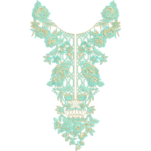 The embroidery showcases a beautiful combination of turquoise floral motifs with intricate golden ornamental detailing and delicate leaf patterns. The symmetrical arrangement of roses, decorative lattice elements, and ornamental borders creates a balanced and luxurious appearance. This design adds a refined and designer-inspired touch to both traditional and modern outfits.