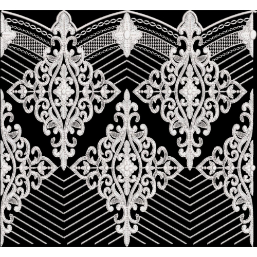 Behind the ornamental elements, a subtle chevron line pattern adds depth and structure without overpowering the main motifs. The embroidery-style stitching enhances the handcrafted quality of the design, giving it a refined and elegant finish suitable for high-end textile applications.