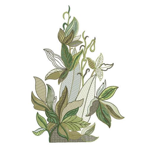 This textile print showcases a refined botanical leaf composition with a calm and sophisticated aesthetic. The design features overlapping leaves in varying shades of green, olive, and muted beige, rendered with fine line work and subtle textural detailing that creates an embroidery-inspired effect. The absence of flowers places emphasis on form, structure, and natural rhythm.
