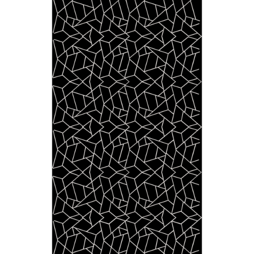 This design features a modern abstract geometric pattern composed of interconnected angular white lines arranged across a deep black background. The pattern forms an all-over layout with irregular polygonal shapes, creating a dynamic and contemporary visual rhythm.