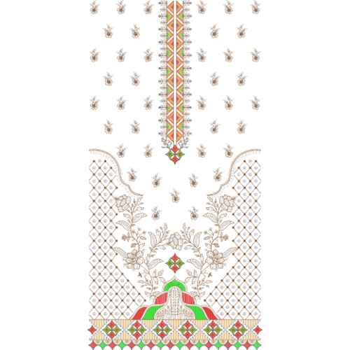 Side panels are adorned with subtle geometric textures and ornamental detailing that frame the composition beautifully. The lower section is completed with a bold decorative border combining geometric shapes, stylized motifs, and ornamental patterns that provide a polished and luxurious finish. Ideal for dresses, kurtis, festive wear, and designer outfits, this embroidery pattern offers a perfect balance of modern geometric styling and classic floral elegance for high-end fashion creations.